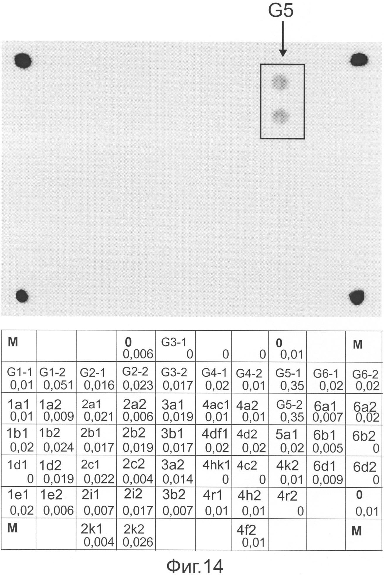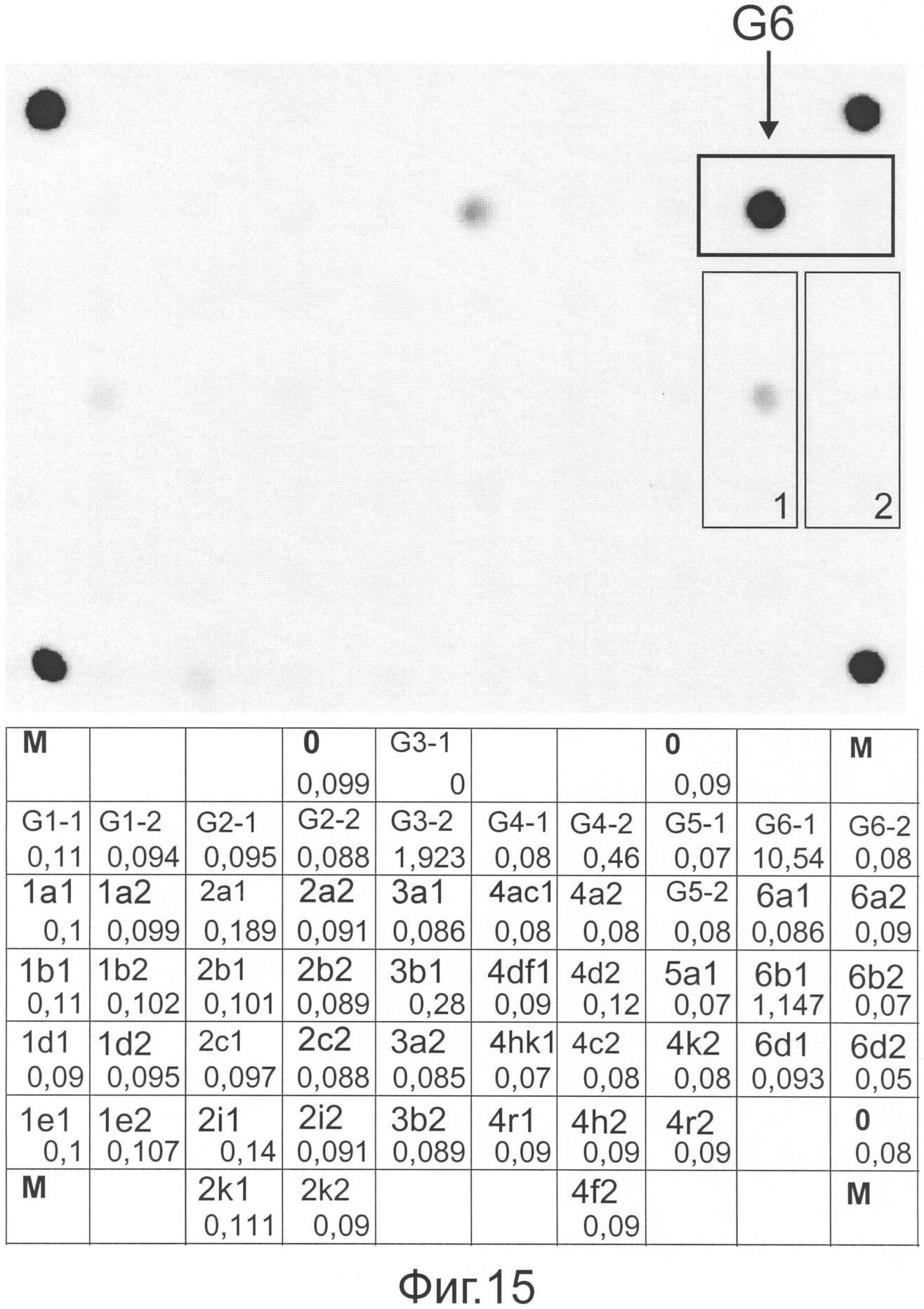 На фиг.14 представлены гибридизационная картина микрочипа и распределение нормированных гибридизационных сигналов ячеек микрочипа.