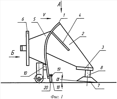 Рабочий орган для удаления снежно-ледяного наката с поверхности дорог и аэродромов состоит (см. фиг.1) из рамы, выполненной в виде отвала 1, снабженного двумя вертикальными передними кронштейнами 2, с закрепленной на них пластиной 3, жесткость крепления вертикальных передних кронштейнов 2 к отвалу 1 обеспечивается дополнительной установкой двух укосин 4. Двумя вертикальными задними кронштейнами 5 отвал 1 жестко закреплен к опорной плите 6, служащей для присоединения рабочего органа к базовой машине. В нижней части пластины 3 размещены не менее шести режущих дисков 7, каждый из которых установлен на оси 8, с возможностью свободного вращения вокруг нее, с углом а наклона нижнего основания диска к поверхности снежно-ледяного наката не более 10°. Изменение угла установки режущего диска 7 на величину большую 10° повлечет за собой увеличение угла резания, определяемого суммой угла установки диска и угла заострения его рабочей кромки, что приведет к значительному возрастанию усилия резания и энергоемкости процесса в целом, которые будут увеличиваться по мере заглубления диска в разрабатываемый массив, так как при этом боковые поверхности диска начнут взаимодействовать с разрушаемой средой на большей площади, обеспечивая сдвиг продуктов разрушения. Кроме того, уменьшится рабочая зона диска, и соседние режущие диски будут работать без взаимного перекрытия рабочих зон, оставляя участки не разрушенного массива в промежутках между дисками. Продольная ось рабочего органа расположена с возможностью поворота в горизонтальной плоскости на угол не более 43° к направлению его движения V. Такое расположение рабочего органа обеспечивает оптимальное перекрытие рабочих зон соседних дисков при ширине захвата, обеспечивающей достаточно высокую производительность. Изменение угла на величину, большую 43°, повлечет за собой увеличение ширины захвата рабочего органа, но при этом не будет обеспечено взаимное перекрытие рабочих зон режущих дисков, и в промежутках между дисками будут оставаться участки не разрушенного массива. Кроме того, каждый режущий диск будет взаимодействовать с цельным, закрытым со всех сторон массивом (блокированная схема резания), что значительно увеличит усилие резания и энергоемкость процесса по сравнению с резанием при перекрытии рабочих зон, когда каждый режущий диск (кроме крайнего переднего) взаимодействует с массивом, частично разрушенным соседним предыдущим диском (полублокированная схема резания). По краям отвала 1, с его тыльной стороны установлены два рояльных колеса 9 (см. фиг.4), каждое из которых прикреплено к отвалу 1 посредством горизонтального кронштейна 10 и вилки 11 с осями 12 и 13. Вилка 11 состоит из двух параллельных установленных вертикально пластин 14 с отверстиями для установки оси 12 и двух параллельных установленных горизонтально пластин 15 с отверстиями для установки оси 13, жестко прикрепленных к пластинам 14. Для регулировки глубины погружения рабочей кромки режущего диска 7 в разрабатываемый массив между верхним и нижним торцами горизонтального кронштейна 10 и смежными с ними гранями горизонтальных пластин 15 установлены соответственно верхний 16 и нижний 17 пакеты регулировочных прокладок. Вдоль нижней кромки отвала 1 при помощи листовой пластины 18 и болтов 19 закреплен эластичный нож 20.