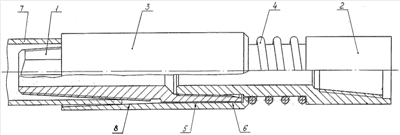 Действительно, метчик, перемещаясь в осевом направлении, входит внутрь трубы и, нарезая на ее внутренней поверхности резьбу, соединяется с ней. При этом, если труба изношена до предела, то воронка входит в контакт с ней в крайнем нижнем положении относительно метчика и сохраняет его до начала процесса захвата трубы. Если оборванная труба не изношена, т.е. практически новая, то контакт конуса воронки с концом трубы произойдет раньше. В этом случае пружина начнет сжиматься. После появления контакта метчика с концом трубы в обоих указанных случаях метчик сжимает пружину, врезаясь в тело трубы вплоть до окончания процесса захвата бурильной колонны, оставленной в результате обрыва трубы в скважине. В обоих случаях воронка предотвращает разрыв трубы при внедрении в нее метчика, и, следовательно, заявляемое устройство повышает надежность захвата трубы