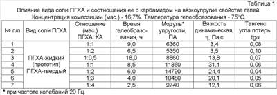 Из данных табл.1 следует, что гели на основе ПГХА обладают преимущественно упругими свойствами (tg =0,05÷0,10), однако при использовании твердого ПГХА показатели модуля упругости и вязкости гелей в 2 и более раза выше, чем для композиций на основе жидкого ПГХА. Увеличение содержания карбамида в композиции приводит к уменьшению времени гелеобразования и некоторому снижению показателей вязкоупругих свойств гелей.