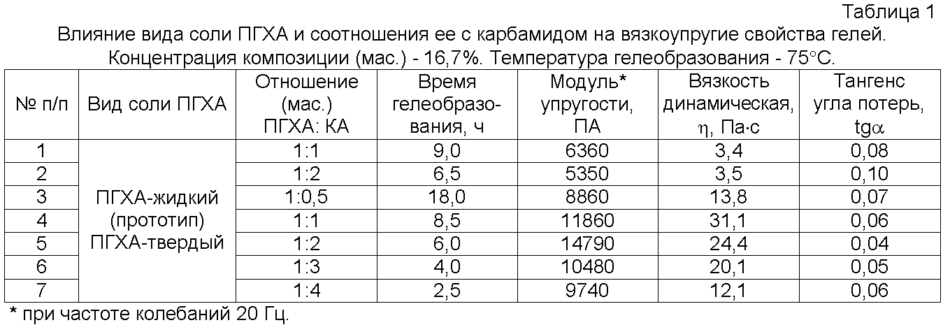 Пример 1. В этом примере обусловлено влияние типа соли алюминия и соотношения его с карбамидом на микроструктуру геля и его вязкоупругие свойства. Сухой твердый ПГХА-Т и карбамид загружают в 0,3%-ный раствор полиакриламида в соотношениях, указанных в табл.1, и в количествах, обеспечивающих общую концентрацию композиции 16,7 мас.%. Приготовленный раствор заливают в углубление в форме из прозрачного полистирола диаметром 30 мм и глубиной 5 мм. Герметически закупоренную форму помещают в термостат и нагревают при 75°С до момента гелеобразования, наблюдаемого по потере текучести композиции. После охлаждения образцы в форме дисков вынимают из формы и переносят на нижнюю плиту вибрационного микро-Фурье-реометра MFR-2000 (GBS, Австралия), с помощью которого определяют динамическую вязкость, модуль упругости и тангенс угла потерь (табл.1). Одновременно проводили микрофотографирование поверхности образцов с помощью оптического модульного моторизованного микроскопа Olimpus BX-61 С с фиксацией микроструктур КМ с помощью цифровой камеры микроскопа ДП-12.