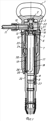 Кожух 7 (глушитель) выполнен в виде монолитной детали (фиг.6-8) из резины. Обращенная к рабочему инструменту часть кожуха 7 усилена уплотнением 30, что придает кожуху 7 повышенную жесткость и позволяет надежно удерживать молоток рукой при горизонтальном или близком к нему положении инструмента. В уплотнении 30 выполнены сквозные осевые отверстия 26 для вывода отработанного воздуха. На наружной поверхности кожуха 7 (глушителя) имеются выступы 31, позволяющие увеличить жесткость конструкции и надежность удержания молотка в процессе работы.