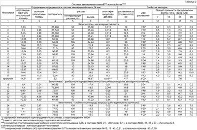 Молотая цеолитовая порода и молотый портландцементный клинкер характеризуются остатком на сите Рассол может быть представлен композицией природного рассола и воды или галогенных пород и воды. В таблице 2 составы Верхний предел минерализации рассола, используемого при производстве составов закладочных смесей, ограничивается 105 г/л. При превышении данного предела наблюдается потеря подвижности закладочных смесей в течение 0,5 часа, что недопустимо по условиям обеспечения транспортабельных свойств закладочных смесей и минимизации недозакладки (см. состав Нижний предел минерализации применяемого рассола ограничивается 20 г/л, поскольку снижение данного предела негативно отражается на прочности закладки и увеличивает усадку, см. составы При превышении заявляемого содержания рассола в закладочной смеси (26,96%) увеличивается усадка, и снижается прочность закладки (см. таблицу 2, состав Верхнее количество портландцемента или его молотого клинкера (13,68%) ограничивается достижением максимальной требуемой прочности закладки (10,1 МПа) на основе худшего по качеству заполнителя – мелкозернистого песка (состав 6). Такая прочность обычно требуется в наиболее ответственной части закладочных массивов сопряжениях разрезных штреков с очистными заходками. Нижнее содержание цемента в заявляемой смеси – 1,4% (см. таблицу 2, состав Верхний предел в заявляемом составе молотых цеолитовых пород (10,40%) ограничивается по условию увеличения потребности в рассоле для достижения требуемых реологических параметров и, как следствие – незначительным снижением, а не повышением прочности закладки при увеличении содержания цеолитовых пород (см. таблицу 2, состав При дозе пластифицирующей добавки в составе закладочной смеси более 0,3% (состав Примеры приготовления закладочных смесей. При получении закладочных смесей могут быть использованы различные заполнители, например: мелкозернистый песок месторождения «Прикарьерное», измельченные диабазовые породы и измельченные породы вскрыши. Фракционный состав заполнителей (мм), использованных в приведенных в таблице 2 закладочных смесях, мас.%: а) мелкозернистый песок, мас.%: (более 10) – 1,3; (5-10) – 1,0; (2,5-5) – 1,0; (1,25-2,5) – 0,5; (0,63-1,25) – 0,7; (0,315-0,63) – 9,5; (0,14-0,315) – 43,0; (менее 0,14) – 43,0; б) измельченные диабазовые породы, мас.%: (более 10) – 5,0; (5-10) – 30,0; (2,5-5) – 7,7; (1,25-2,5) – 5,3; (0,63-1,25) – 5,0; (0,315-0,63) – 6; (0,14-0,315) – 10,6; (0,08- 0,14) – 9,0; (менее 0,08) – 21,4; в) породы вскрыши, представленные известняками, доломитами, мергелем, алевролитом и переходными разностями между ними, измельченные и обогащенные по прочности, мас.%: (более 10) – 5,0; (5-10) – 10,0; (2,5-5) – 30,0; (0,14-2,5) – 35,0; (менее 0,14) – 20,0. Качество заполнителя существенно влияет на прочность закладки. В ряду позитивного влияния на прочность закладки заполнители позиционируются следующим образом: измельченные диабазовые породы; измельченные и обогащенные по прочности породы вскрыши; мелкозернистый песок месторождения «Прикарьерное». Однако по сложности подготовки и соответственно стоимости данные заполнители позиционируются тем же образом, что предопределяет возможность использования при производстве закладочных смесей все перечисленные заполнители. Заявляемый диапазон введения ингредиентов закладочной смеси позволяют получить требуемые реологические и прочностные характеристики на любом запол