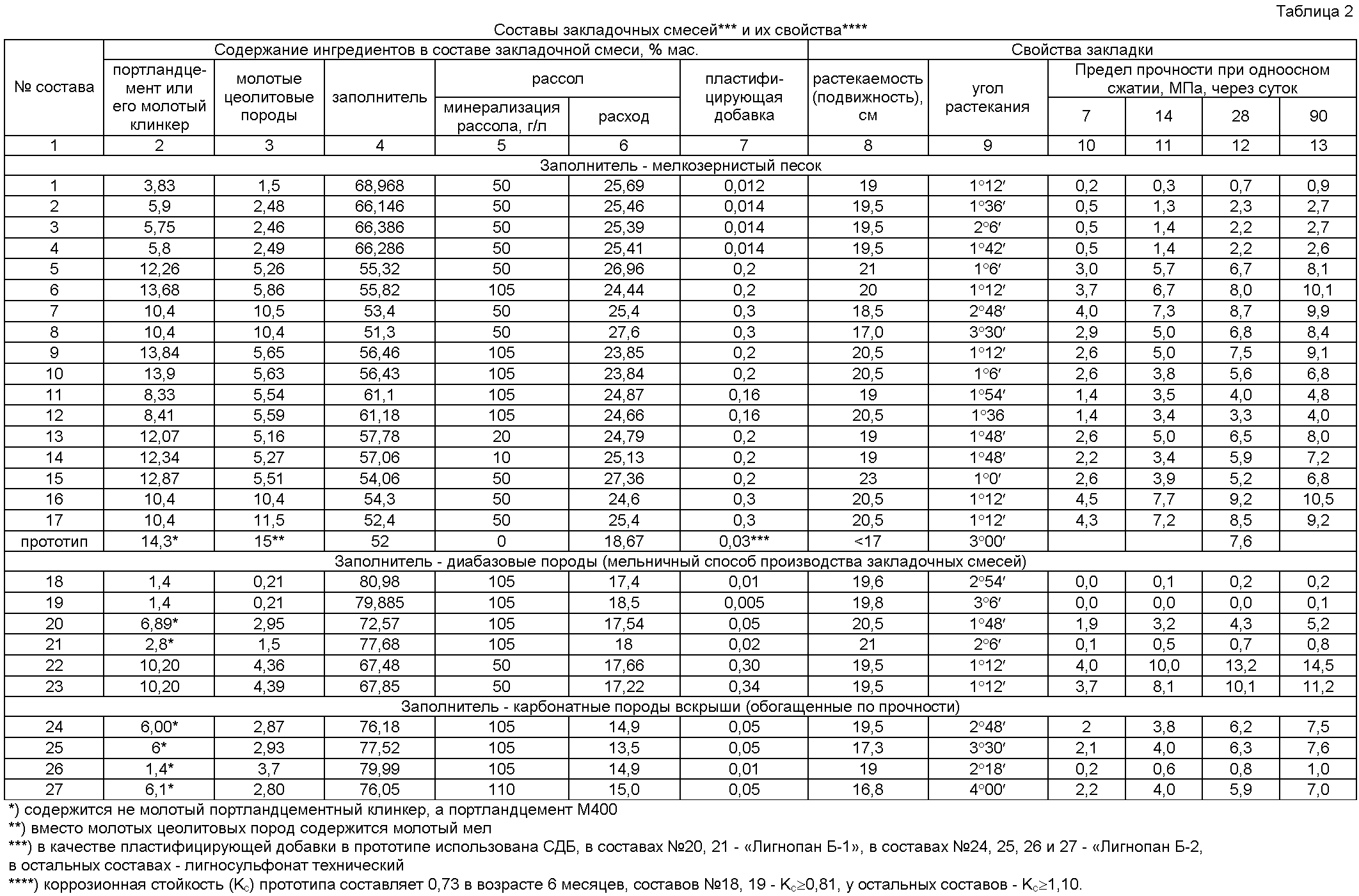 1. Закладочная смесь, содержащая цемент, молотый компонент, заполнитель, пластифицирующую добавку и воду затворения, отличающаяся тем, что в качестве последней содержит имеющий минерализацию 20÷105 г/л рассол, преимущественно хлоридов натрия, с температурой, обеспечивающей температуру закладочной смеси не ниже +15°С, в качестве молотого компонента – молотую цеолитовую породу, в качестве цемента – портландцемент или молотый портландцементный клинкер при следующем соотношении компонентов состава, мас.%: