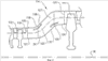 Значительная кривизна кожуха 4 (см. участок 130 стенки газового канала) при его изгибе в направлении наружу по радиусу может приводить к существенному падению статического давления в месте, где поток ускоряется при движении вдоль выгнутого кожуха 4. Это падение давления привело бы к существенному увеличению абсолютного значения отрицательного градиента давления на большой протяженности, что вызвало бы утолщение граничного слоя и в конечном счете его отделение. Это могло бы привести к ухудшению характеристик канала 5f. Данная проблема решается или по меньшей мере облегчается за счет размещения в газовом канале 5f промежуточного узла кольцевого направляющего или крыловидного элемента 128 в непосредственной близости от изогнутого участка 130 наружной стенки, составляющей часть кожуха 4.