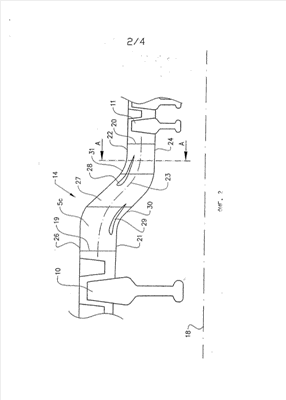 Большая кривизна участка 30 внутренней стенки газового канала в месте его изгиба вовнутрь по радиусу, как показано на фиг.2, может приводить к сильному падению статического давления вдоль внутренней стенки, у которой поток ускоряется при движении вдоль выгнутой части 30. Это падение давления может приводить к значительному и протяженному градиенту давления, что ведет к утолщению граничного слоя и в конечном счете к его отделению, что может давать ухудшение характеристик канала. Эта проблема решается или, по меньшей мере, облегчается за счет размещения в газовом канале промежуточного узла направляющего или крыловидного элемента 29 в непосредственной близости от изогнутого участка 30 внутренней стенки, составляющей часть ступицы 3. Направляющий элемент 29 проходит по окружности авиационного двигателя 1 и имеет форму непрерывного кольца.