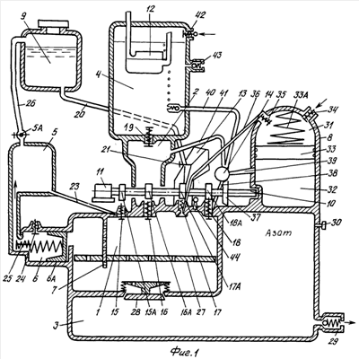 Двигатель работает следующим образом. При включении привода 11 (см. фиг.1) распредвала 10 кулачок 16А открывает клапан 16 и определенная порция рабочей жидкости под избыточным давлением поступает из дозатора 2 в камеру взрыва 1, после чего клапан 16 закрывается и открывается клапан 17, производя загрузку из топливного устройства 13 топливом и одновременно с ним создается избыточное давление чистого воздуха из верхней части 31 пневмоаккумулятора 8, который подается в камеру взрыва 1 для создания степени сжатия, обеспечивая высокую эффективность взрыва топлива, затем клапан 17 закрывается и открывается клапан высокого давления воздуха 15, обеспечивающий наибольшую необходимую степень сжатия в камере взрыва 1, затем подается искра от свечи зажигания 44 в камеру взрыва 1, в результате чего происходит управляемый взрыв топлива в замкнутом пространстве. При этом поршень 6А, перемещаясь, сжимает пружину под действием резкого увеличения давления в камере взрыва 1 и выталкивает часть чистого воздуха в резервуар пневмоаккумулятора высокого давления 5, производя подзарядку пневмоаккумулятора 5 и смягчая удар на платформу от силы взрыва топлива.
