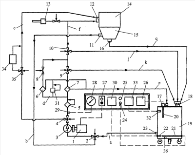 В том случае, если пропускная способность системы смазки небольшая, можно часть промывочной жидкости после фильтров 8, 9 отводить непосредственно в гидробак 19, минуя двигатель 14. Для этого кран 9 с помощью трубопровода k подключают к штуцеру 18 гидробака 19. Кран 9 устанавливают в положение подачи жидкости в гидробак 19, тогда одна часть очищаемой промывочной жидкости поступает на промывку системы смазки ДВС, а другая часть сливается в гидробак 19.