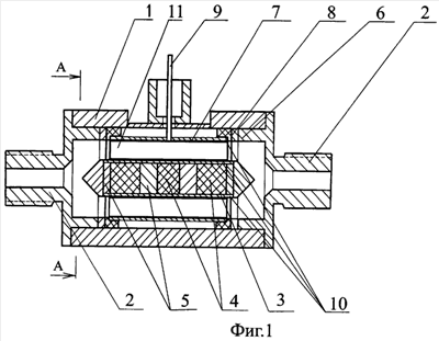 Устройство обработки топлива содержит корпус 1 из проводящего материала, входной и выходной штуцеры 2. В данном устройстве направление движения топлива не имеет значения, поэтому каждый из штуцеров может быть как входным, так и выходным. Соосно с корпусом расположена магнитная система, состоящая из тонкостенной трубки 3, постоянных магнитов 4 и магнитопроводов из магнитомягкого материала 5. Магнитная система является при этом герметичной. Магнитная система позиционируется на оси корпуса с помощью перфорированных дисков 6, обеспечивающих и электрическое соединение трубки 3 с корпусом 1 (показано на фиг.2). Распределение силовых линий магнитного поля в полости обработки приведено на фиг.3. Положительный электрод 7 изолирован от корпуса перфорированной диэлектрической (например, тефлоновой) прокладкой 8 и соединен с “+” источника питания (на схеме не показан) токовводом 9. Внешняя поверхность трубки 3 и внутренняя поверхность электрода 7 также покрыты тонким слоем диэлектрического материала 10 и образуют полость обработки 11. Магниты, использованные нами, имеют цилиндрическую форму, как и само устройство. Однако понятно, что возможно использование устройств с формой, отличной от приведенной.