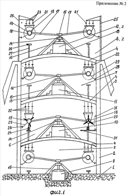 Около одной из вертикальных колонн 2 сооружен вертикальный защищенный вход – винтовая лестница 30 для персонала с выходом в каждый машинный зал при выполнении смотровых, регламентных и ремонтных работ. Все машинные залы по окружности снабжены метровым прутковым надежным ограждением, которое не мешает движению воздушных масс работающих движителей аэропривода.