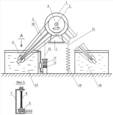 Устройство работает следующим образом. Рабочий элемент 8 и контрпружины 14 и 17 кинематически связаны между собой с помощью тросов 11, 12, шкивов 3, 4 на оси 2, гибкой связи 10 и шкива 9 таким образом, что суммарное усилие пружин 14 и 17 создает крутящий момент на свободном конце торсиона 8 и, наоборот, крутящий момент, создаваемый торсионом 8, вызывает растяжение/сжатие пружин 14, 17. Коэффициенты жесткости пружин являются константой, а коэффициент жесткости торсиона меняется с изменением его температуры. Диапазон колебания значения коэффициента жесткости торсиона и величина коэффициентов жесткости пружин подобраны таким образом, чтобы при изменении температуры торсиона в заданном интервале при данной кинематической схеме рычаг 5 совершал повороты на заданный угол из одного крайнего положения в другое. В точках, соответствующих этим положениям, установлены на основании 1 сосуды 15 и 16 с водой. В сосуде 16 находится вода с температурой окружающего воздуха, в том числе подогреваемая, при возможности, солнечными лучами. В сосуд 15 вода подается из подземного источника с помощью насоса, поршень 13 которого приводится в действие за счет крутящего момента, создаваемого торсионом 8, и усилий пружин 14, 17. Металл, из которого изготовлен торсион 8, имеет критические точки фазового превращения (обеспечивающего эффект памяти формы) в районе 15 и 20°С, поэтому в емкости 15 с подземной водой торсион имеет малый коэффициент жесткости, а в емкости 16 с теплой водой, имеющей температуру окружающего воздуха, – большой. Соответственно, в емкости 15 торсион скручивается под действием усилия пружины 14, а в емкости 16 – раскручивается под действием развиваемых внутренних усилий, возникающих при эффекте памяти формы. В результате этого шкив 9 совершает возвратные повороты, которые через гибкую связь 10 передают на шкивы 4 и 3, которые также совершают повороты, приводя в движение поршень 13 с помощью троса 11. В результате описанной работы устройства происходит приведение в действие водоподъемного насоса в условиях летнего сезона.
