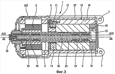 Как можно ясно видеть на фиг.3, вал 8 двигателя 3 и внутреннего зубчатого колеса 9 является полым, и соединительная тяга 22, прикрепленная к удаляемой стенке 10, проходит через него с зазором. Подшипники 23, 24 установлены на соединительной тяге 22 и участвуют во вращении внутреннего зубчатого колеса 9. Винт 25, входящий в зацепление на свободном конце соединительной тяги 22, поддерживает торец кожуха 2, противоположный торец по отношению к удаляемой стенке 10, чтобы плотно прижать указанную удаляемую стенку 10 к указанному кожуху.
