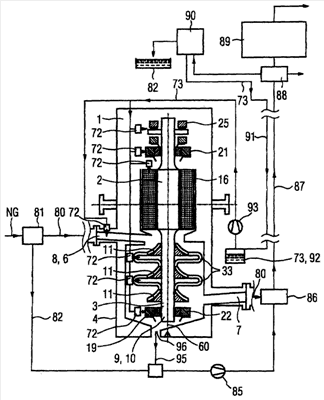 Электромагнитные подшипники 21, 22, 25 охлаждаются охлаждающей системой (не показана) до рабочей температуры, причем охлаждающая система предусматривает ответвление в одном перетоке компрессора 3. Из ответвления по трубопроводам через фильтр направляется часть добываемой среды, преимущественно природного газа, а затем по двум отдельным трубопроводам – к внешним местам опоры (первый 21 и второй 24 радиальные подшипники и упорный подшипник 25). Это охлаждение посредством холодной добываемой среды 80 делает ненужными дополнительные питающие линии.