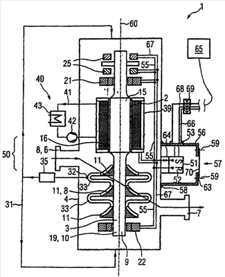 На верхнем конце общего вала 19, т.е. на верхнем конце ротора 15, предусмотрен упорный подшипник 25. Радиальные 21, 22 и упорный 25 подшипники имеют электромагнитный принцип работы и, соответственно, заключены в кожухи. Радиальные подшипники 21, 22 расположены при этом в направлении периферии вокруг соответствующего места опоры вала 19, выполнены с возможностью вращения на 360° и неразъемными.