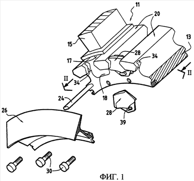Кроме того, каждый замок 28 содержит продолжение 28а, направленное радиально внутрь и содержащее отверстие 39 для прохождения вышеупомянутой колодки 24. Колодку устанавливают на дне паза под ножкой лопатки, а также в толще замка.