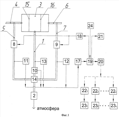 Информация от преобразователей давлений 12, 13 поступает через АЦП 17 на сервер 19, где информация приводится к виду, имеющему физическую размерность.