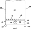 Фиг.2 схематически показывает упрощенное вертикальное сечение нижней части топки 12 котла с псевдоожиженным слоем, имеющего контур воды в соответствии с предпочтительным вариантом осуществления настоящего изобретения. Фиг.2 показывает переднюю стенку 14 и заднюю стенку 38, которые образованы панелями кипятильных трубок топки 12, так же как воздушная камера 20. Фиг.2 также схематично показывает воздушную камеру 20 с форсунками 40 сжижающего газа, которые расположены между трубками 42 решетки.
