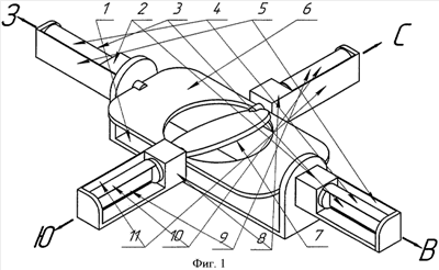 редукторы вращения север-юг 2, приводы вращения север-юг 3, подвижные световые экраны 4, сопряженные с приводами 3, корпуса 5 вращательных узлов север-юг, платформу вращения север-юг 6, на которой размещены: зеркальный отражатель 7, редукторы вращения восток-запад 8, приводы вращения восток-запад 9, подвижные световые экраны 10, сопряженные с приводами 9, корпуса 11 вращательных узлов восток-запад. Общие оси вращения север-юг и восток-запад перпендикулярны друг другу и проходят через одну точку, находящуюся в геометрическом центре плоскости фигуры зеркального отражателя, имеющей поворотный центр симметрии. Зеркальный отражатель и платформа вращения север-юг являются составными частями двух общих осей вращения север-юг и восток-запад. Редукторы расположены соосно с осями вращения, между приводом и осью.