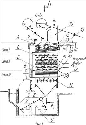 Теплоизолированная (например, минватой) зерносушилка 7 содержит приемный бункер (завальная яма), загрузочную норию 2 и рециркуляционную норию 9, систему подводящих треугольных коробов В, открытых снизу для подвода и отвода нагретого воздуха (сушильного агента) в сушильные шахты, вводной (входной) канал шахты для ввода подогретого сушильного агента, наклонный трубный охладитель А для конденсации влаги сушильного агента, трубный охладитель зерна С с вентилятором 12, приводную заслонку-шибер 3, приводной инвентор-рассекатель зерна 8, приводное выгружное устройство 11, приводную заслонку 6, сборник воды 5, бункер сухого зерна 14 и циклон 10.