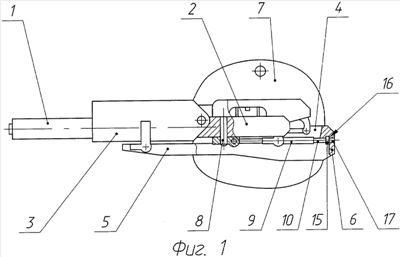 Автоматическое оружие выполнено в виде высокотемпного двуствольного зенитного автомата 1. Зенитный автомат 1 состоит из ствольной коробки 2 и агрегата стволов 3. Зенитный автомат 1 установлен в качающейся части 4, размещенной на боковой поверхности башни боевой машины. Качающаяся часть 4 состоит из люльки 5 с силовой перемычкой 6. Люлька 5 закреплена на поворотной цапфе 7. Ствольная коробка 2 снабжена осью 8 с закрепленным на ней корпусом амортизатора 9. В корпусе амортизатора 9 установлены: шток 10 с набором внешних 11 и внутренних 12 колец, упорные кольца 13 и компенсатор 14. Компенсатор 14 одной торцевой поверхностью взаимодействует с упорным кольцом 13, а другим – со ствольной коробкой 2. Шток 10 снабжен буртиком 15, размещенным в пазу 16 силовой перемычки 6, и зафиксирован подпружиненным плунжером 17.