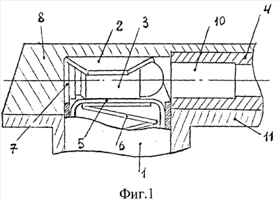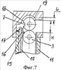 В случае расположения загиба 13 на стволе 4 (Фиг.4) или загиба 19 на рамке 11 (Фиг.6) отводить затвор 8 назад для того, чтобы вставить магазин 1 в рамку 11, не требуется. В этом случае при досылке магазина 1 вверх наклонная поверхность 16 подпружиненного фиксирующего выступа 15 патрона 3 магазина 1 взаимодействует с соответствующей наклонной поверхностью 17 (Фиг.4, Фиг.5) выступа 13 ствола 4 или наклонной поверхностью 17 (Фиг.6, Фиг.7) выступа 18 рамки 11. При следующем движении вверх магазина 1 наклонные поверхности 16, 17 отклоняют фиксированный выступ 15, освобождая верхний патрон 3, в результате чего при отводе затвора 8 назад под действием подпружиненного подавателя 5 патрон 3 поднимается вверх на линию досылания – ось канала ствола 4.