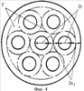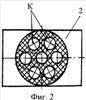 Изобретение поясняется чертежом, где на фиг.1 изображена навеска пороха 1, размещенная в картузе или пересылочном мешке 4, на фиг.2 – зерно навески 2 (поперечное сечение) с каналами К, на фиг.3 – варианты конкретного исполнения, на фиг.4 укрупненно показано зерно навески (вид с торца), где 2е1 – толщина горящего свода, D – диаметр каналов К, Г – силовые конструктивные элементы.
