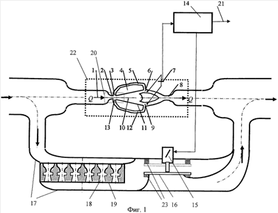 Расходомер газа представлен на фиг.1, где обозначено: 1 – поток газа; 2 – сопло струйного генератора-расходомера; 3 и 13 – управляющие каналы; 4 и 11 – стенки камеры; 5 и 12 – канал обратной связи; 6 и 9 – выходные каналы из камеры; 7 – преобразователь электрических сигналов, например пьезоэлемент; 8 – выходной канал струйного генератора; 10 – камера струйного генератора; 14 – вычислитель вместе с вторичной электронной аппаратурой, которая усиливает и формирует сигналы в стандартные формы; 15 – дискретный электромагнитный клапан; 16 – затвор, открывающий проток газа через байпас (пунктиром показано другое положение затвора); 17 – байпас; 18 – ячейка струйного сопла для байпаса; 19 – сотовый набор ячеек струйных сопел; 20 – ячейка струйного генератора; 21 – выход вычислителя расходомера; 22 – струйный генератор; 23 – постоянные магниты конечного положения затвора клапана.