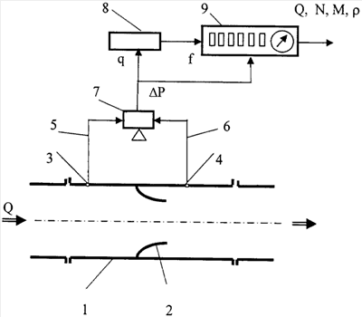 На чертеже обозначено: 1 – труба с измеряемым потоком среды; 2 – сужающее устройство; 3 и 4 – точки отбора давления; 5 и 6 – импульсные каналы отбора давления; 7 – дифференциальный манометр с пневматическим выходом; 8 – струйный генератор; 9 – вычислительное устройство.