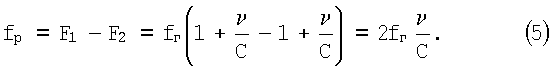 При неподвижной среде скорости распространения звука в обе стороны от излучающего преобразователя 2 будут одинаковыми, а значит, частоты электрических сигналов, снимаемых со всех трех принимающих акустических преобразователей, будут равны между собой и равны fг. Если же газовая среда движется со скоростью v, то при движении волны по потоку газа ее частота, воспринимаемая акустическими преобразователями 4 и 5, будет увеличиваться в соответствии с выражением: