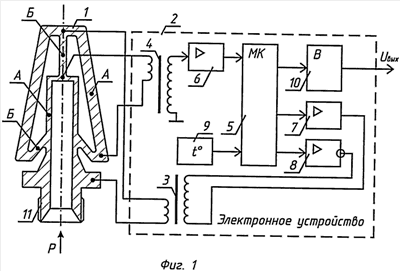 Жидкая или газообразная среда с давлением Р, подлежащим измерению, через приемный штуцер 11 поступает в герметичную полость упругого элемента 1 и воздействует на его элементы (детали, составные части) А и Б, испытывающие соответственно деформации растяжения или сжатия (фиг.1-3). В результате этого происходит изменение длины и площади поперечного сечения элементов (деталей, составных частей) А и Б упругого устройства 1. Это приводит к изменению их омического сопротивления и к разбалансировке образованного ими тензомоста пропорционально приложенному давлению.