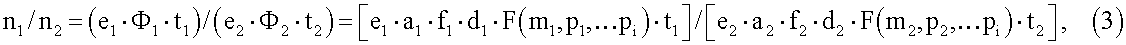 Накопленные количества импульсов n1 от фотонов Bi-214 за время t1 от пробы почвы и n2 от фотонов К-40 за время t2 от пробы соли KCl можно измерить, а величины функции F(m,p1, ,pi) можно рассчитать исходя из параметров используемых источников излучения фотонов и геометрии измерения.
