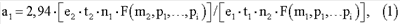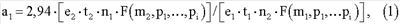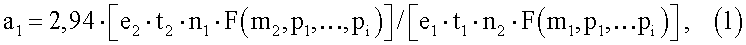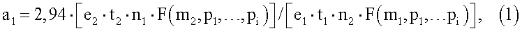 где a1 – удельная активность Ra-226 в пробе почвы, Бк/г; e1[е2] – эффективность детектора для фотонов Bi-214 гамма-линии 0,6093 МэВ [К-40 гамма-линии 1,46 МэВ]; m1[m2] – линейный коэффициент ослабления фотонов Bi-214 в почве (фотонов К-40 в соли KCl], см-1; p1, ,pi – параметры, определяющие геометрию измерения пробы; F(m1,p1, ,pi) [F(m2,р1, ,pi)] – функция геометрии измерения потока фотонов от пробы почвы [соли KCl], см.