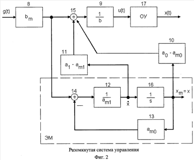 Управление u(t) согласно (5) может быть реализовано в двух вариантах: в виде системы управления (включающей соединение регулятора Р, эталонной модели ЭМ и объекта управления ОУ) замкнутого типа, фиг.1, и разомкнутого типа, фиг.2. При этом вариант системы по фиг.1 требует определения старшей производной от выходного сигнала x(t) объекта управления. При объекте управления высокого порядка ошибка в определении старших производных на практике может быть велика. При наличии аддитивной помехи f(t) с уравнением объекта управления