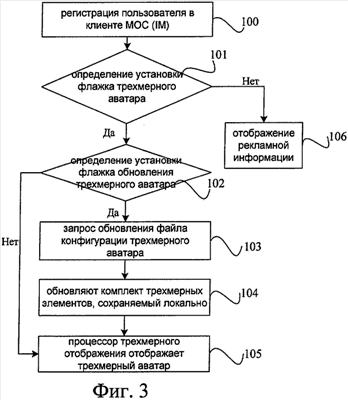 На Фиг.3 показана блок-схема отображения и обновления трехмерного аватара, предусматриваемые способом отображения трехмерного аватара согласно одной из реализаций настоящего изобретения. Сначала на шаге 100 происходит регистрация пользователя в клиенте МОС (IM). На шаге 101 клиент МОС (IM) определяет, установлен ли флажок трехмерного аватара для данного пользователя. Флажок используется для указания на конфигурирование трехмерного аватара пользователем. Если для данного пользователя флажок установлен, это означает, что пользователь конфигурировал трехмерный аватар, в противном случае – что пользователь не конфигурировал трехмерный аватар. Пользователь, упомянутый на шаге 100, может быть пользователем, который зарегистрировался для использования клиента МОС (IM), или же собеседником пользователя, зарегистрировавшегося в клиенте МОС (IM). Если для данного пользователя флажок трехмерного аватара не установлен, клиент МОС (IM) переходит к шагу 106, например, отображает рекламную информацию.