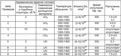 Для полной компенсации реакторного распухания ядерного топлива в пределах от 1,5 до 4,5% достаточно ввести в состав химического соединения делящегося материала 2,15-6,43 об.% фуллеренов или фуллереноподобных структур. Поскольку реакторное распухание может превышать указанные в таблице значения и при более жестких реакторных испытаниях достигать 6%, следовательно, количество фуллеренов и фуллереноподобных структур в состав химического соединения делящегося материала целесообразно вводить в пределах от 2 до 10 об.%. Пример: Фуллерены и фуллереноподобные структуры получали пиролизом С3Н6 на частицах углерода с нанесенными на их поверхность катализаторов из оксидов Fе2О3-NiO3 при температуре 1000°С-1250°С с последующей экстракцией фуллеренов и фуллереноподобных структур с отделением частиц углерода. Полученный продукт экстракции содержал порядка 60 мас.% фуллеренов и остальное фуллереноподобные структуры – однослойные и многослойные нанотрубки и графеновые нановолокна. Фуллерены и фуллереноподобные структуры смешивали в шаровой мельнице с керамическим топливом – диоксидом урана, мононитридом и монокарбидом урана, прессовали топливные таблетки и спекали в атмосфере инертного газа (аргон) при температуре 1800°С. В таблице приведены данные по реакторному распуханию предложенного керамического ядерного топлива, содержащего фуллерены и фуллереноподобные структуры в сопоставлении с реакторным распуханием известного керамического ядерного топлива. Как следует из приведенных в таблице данных предложенное керамическое ядерное топливо (примеры 1-3, 5-7, 9-11) обеспечивает в сравнении с известным ядерным топливом (примеры 4, 8, 12) повышение радиационной стойкости, а в некоторых случаях полностью исключает реакторное распухание. Снижение содержания фуллеренов и фуллереноподобных структур в топливе менее 2 об.% становится малоэффективным, а увеличение содержания более 10 об.% нецелесообразно, т.к. при этом снижается загрузка топлива и, следовательно, эффективность реактора.