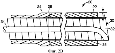 В одном варианте осуществления, как изображено на Фиг.2 В, эластично восстанавливающийся адаптер 20 поддерживается в радиально расширенном или предварительно растянутом состоянии на съемном жестком несущем сердечнике 30. В этом варианте осуществления адаптер 20 может в общем упоминаться как предварительно растянутая труба холодной усадки. В этом радиально расширенном состоянии изолирующая часть 22 определяет растянутую толщину ts, которая меньше, чем исходная толщина tr на Фиг.2А. Выражения «эластично восстанавливающийся», «эластично усаживающийся» и «холодной усадки» используются взаимозаменяемо для обозначения того, что изделие дает усадку при температурах приблизительно от примерно -20°С до примерно 50°С без дополнительного нагрева.