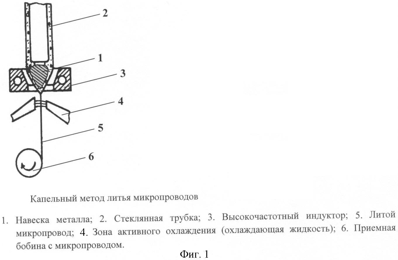 Наиболее реализованными являются два способа: капельный и непрерывный [1]. Сущность капельного способа заключается в следующем (фиг.1): навеску жилообразующего металла (1) весом порядка 10 г помещают в запаянную с одного конца стеклянную трубку (2) диаметром 9-12 мм и расплавляют с помощью высокочастотного индуктора (3). Расплавленная капля металла размягчает стекло до технологической вязкости, позволяющей из стеклянной трубки сформировать тонкий капилляр. Капилляр заполняется расплавом металла, проходит зону активного охлаждения (4) с явно выраженным фронтом кристаллизации и в виде микропровода (5) забрасывается на вращающуюся приемную бобину (6). Диаметр получаемых таким способом микропроводов составляет 5-40 мкм.