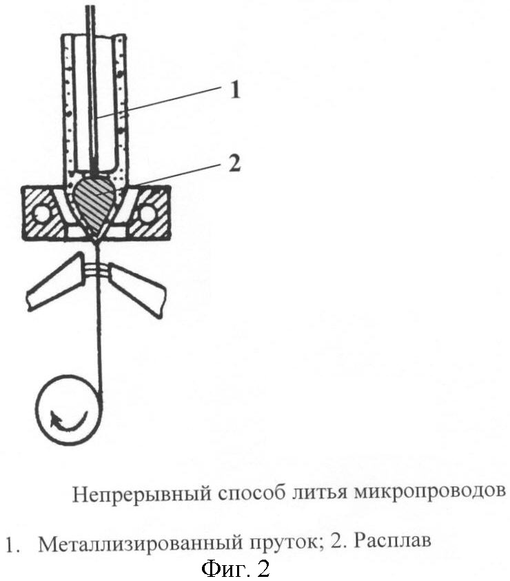 Способ получения наноструктурированных микропроводов, включающий размещение навески (1) жилообразующего материала внутри стеклянной трубки (2), расплавление трубки с навеской в поле высокочастотного индуктора (3), формирование микрованны, вытягивание из нее капилляра (4), заполненного жилообразующим материалом, и создание фронта кристаллизации жилы (5), отличающийся тем, что, с целью получения наноструктурированного микропровода (6) диаметром менее 3 мкм, длиной не менее 1000 м со стабильным химическим составом по длине над расплавленной навеской металла (1) массой 3-5 г, дополнительно в поле автономного индуктора (7) помещается стеклянная трубка (8) меньшего диаметра того же химического состава, что и трубка с навеской металла (9) массой 1-2 г из материала, аналогичного навеске (1), при этом оба индуктора (3) и (7) включаются одновременно, расплавляя навески (1) и (9), после чего производится вытягивание микропровода из навески (1), затем по мере расходования навески (1) до объема, составляющего 70% от начального, производится увеличение мощности индуктора (7) до значения, позволяющего навеске (9), преодолев вязкость стеклянной трубки (8), отделиться от нее и соединиться с навеской (1), не вызывая возмущения процесса литья и обеспечивая пополнение ее объема до исходного состояния, что, в свою очередь, обеспечивает устойчивое протекание процесса получения литых микропроводов со стабильным по длине химическим составом.
