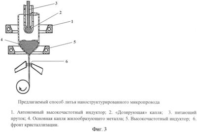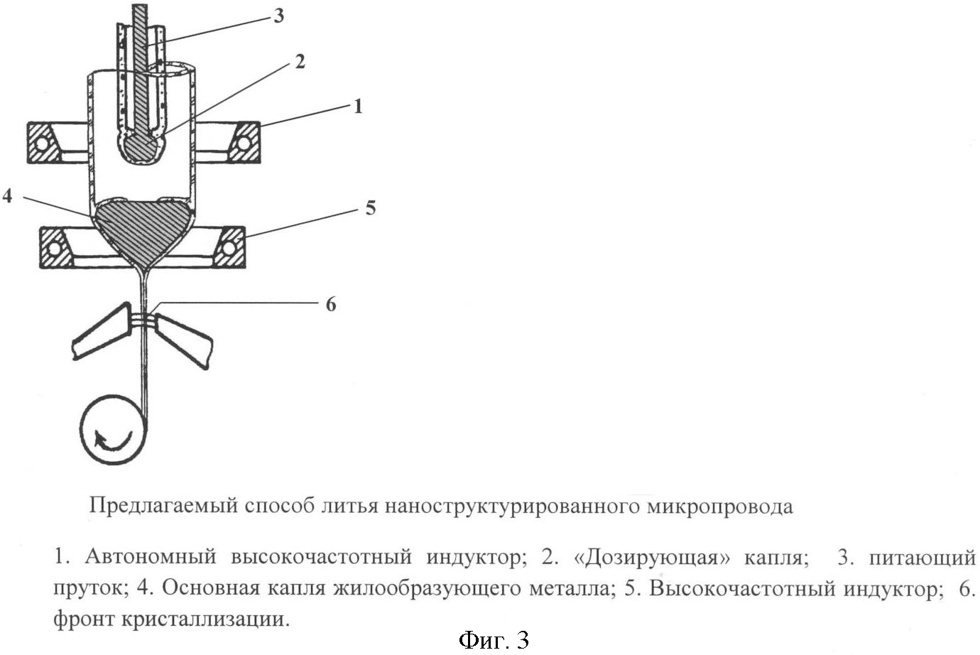 Берутся две стеклянные трубки диаметром 6 и 2 мм (толщина стенки 1 и 0,5 мм соответственно) из боросиликатного стекла типа С37-2, а также навеска металла-меди весом 4 г и медный пруток диаметром 1,2 мм. Формируется процесс литья микропроводов в соответствии со схемой на фиг.3. Включается высокочастотный индуктор типа ЛЗ-13 с двумя автономными индукторами (1) и (5) частотой 440 кГц, капли (2) и (4) доводятся до расплавления. Объем капли (4) постоянно контролируется с помощью специальных СВЧ-датчиков. Верхним фиксирующим репером является поверхность расплава основной капли, нижним – фронт кристаллизации (6) в зоне активного охлаждения. После формирования основной жилообразующей капли (4) и начала устойчивого процесса литья получены микропровода диаметром порядка 1 мкм (фиксируется автоматически) длиной 3600 метров. Объем капли (4) уменьшается на 30%, после чего увеличивается мощность на индукторе (1). Через 3 секунды капля (2) отрывается от прутка (3) и плавно без возмущения процесса пополняется до исходного объема капля (4). Процесс литья устойчиво продолжается. Такая операция повторяется 12 раз. Всего единовременно получено около 45000 метров медного микропровода. С помощью прибора типа «Наноскан» определено наличие наноразмерной структуры (фрагменты размером от 30 до 80 нм).