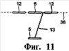 На фиг.11 показано, как подвижный контактный элемент 6, содержащийся в плоскости 36, проходит между электродами 12. Электрическая дуга 13 или ее часть скачкообразно переходит через него на один из электродов 12.