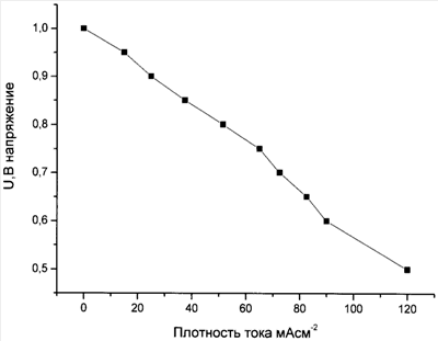 На чертеже представлена вольтамперная характеристика боргидрид-воздушного ТЭ при комнатной температуре. Состав электролита 1М NaBH4, 10% C4F9COON(C4H9)4, 10% глицерина в 5 мл 6 М КОН (без загустителя).