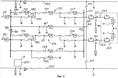 Упомянутая первая проводящая шина или линия 141 через первый разъединитель 161 подключена к средней точке 162 линии 163, соединяющей два проводника 104, 105 HVDC линии электропередач. Упомянутый первый разъединитель рассчитан быть разомкнутым при биполярном режиме преобразовательной подстанции. Линия 163 соединения упомянутых двух проводников выполнена с разъединителями 164, 165 с обеих сторон относительно упомянутой средней точки 162. Эта схема используется для обратного хода.