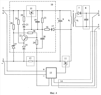 Управляющий вывод электронного ключа 11 соединен с выходным выводом управляющей цепи 13, служащей для формирования управляющих импульсов, скважность которых определяет выходное напряжение блока. «Плюсовой» и «минусовой» выводы питания управляющей цепи 13 подключены, соответственно, к входным «плюсовому» 1 и «минусовому» 2 зажимам, первый вывод обратной связи управляющей цепи 13 соединен с первым выводом резистивного датчика тока 12, а второй и третий выводы обратной связи управляющей цепи 13 соединены с выходом цепи обратной связи по напряжению 14. В рассматриваемом примере цепь обратной связи по напряжению 14 выполнена в виде цепи, соединяющей выходные «плюсовой» 3 и «минусовой» 4 зажимы с вторым и третьим выводами обратной связи управляющей цепи 13.