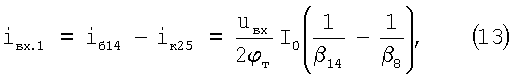 Второе преимущество предлагаемого устройства состоит в том, что в схеме фиг.8 обеспечивается компенсация не только статических входных токов Iвх.1 и Iвх.2, но и их приращений iвх.1 и iвх.2. Как следствие, входное сопротивление ДУ фиг.8 для переменного тока существенно повышается. Действительно, при увеличении напряжения uвх на входе Вх.1 относительно входа Вх.2 увеличивается ток базы iб14: