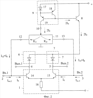 I10=2I0 – суммарный ток общей эмиттерной цепи транзисторов 14 и 15. Таким образом, статический входной ток ДУ фиг.8