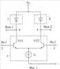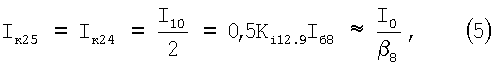 На чертеже фиг.5, в соответствии с п.4 формулы изобретения, дополнительный делитель токов 11 содержит первый 24 и второй 25 вспомогательные транзисторы, эмиттеры которых подключены ко входу 10 дополнительного делителя тока 11, база первого 24 и коллектор второго 25 вспомогательных транзисторов соединены с первым выходом 12 дополнительного делителя токов 11, а база второго 25 и коллектор первого 24 вспомогательных транзисторов соединены со вторым 13 входом дополнительного делителя токов 11.