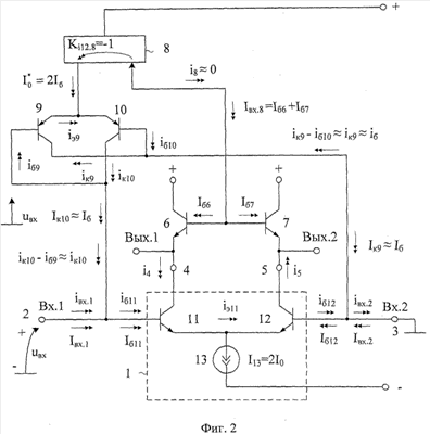 I13 =2I0– суммарный ток общей эмиттерной цепи транзисторов 11 и 12. Таким образом, статический входной ток ДУ на фиг.2