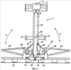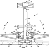 Также на стреле 26 установлены плунжеры 44 и 45. Они присоединены между маятником 10 и плечами 41. Каждый из плунжеров может поднимать или опускать соответствующее плечо в направлении А. Плечи 41 могут быть повернуты вверх и вниз в направлении маятника 10. В этом варианте реализации изобретения опора 7 может поворачиваться (в ее нижней части) по отношению к опоре 3. Плунжер 46 может выполнять поворот опоры 7 относительно установочного узла. Нужно принимать во внимание, что вертикальная опора предназначена для поддержки маятника в вертикальном или по существу вертикальном положении, позволяя, таким образом, маятнику находиться в свободно подвешенном состоянии. Любая опора, такая как рама, которая может содержать поперечные звенья, обеспечивающая такую поддержку маятника, считается вертикальной опорой.