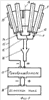 Источник тока 18, преобразователь 17, ключи 16, коммутирующие элементы 15 представляют блочную схему устройства синхронного электроискрового инициирования поочередного запуска двух пар ракет. Эта схема показана для удобства пояснения работы заявляемого оружия с заявляемой ракетой. При этом платформа 12 с четырьмя стволами 9 является базовым элементом для конструкторского воплощения оружия в форме ружья или пистолета.