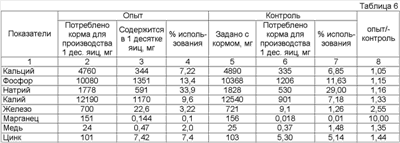 Из приведенных таблиц 3, 4 и 5 видно, что для накопления высокого уровня микроэлементов в яйцах необходимо воздействие в течение всего периода яйцекладки. Наиболее высокая разница определена в уровне содержания марганца 24 мкг в 100 граммах яичной массы, что в восемь раз превышает уровень в контроле. Уровень железа в яйцах кур опытной группы составляет 3,75 мг/%, что в 2,5 раза превышает его уровень в контроле. Рекомендуемая норма потребления железа для мужчин составляет 10 миллиграмм в сутки, потребность женщин в железе вдвое выше, а во время беременности и лактации – 38 и 33 миллиграмм в сутки соответственно. Содержание цинка составило 1,22 против 0,88 в контроле, что на 36% выше. С пищей взрослый человек должен получать цинк в количестве 15 миллиграмм в сутки, беременные и кормящие женщины больше – соответственно 20 и 25 миллиграмм в сутки. Уровень меди в яйцах контрольной группы 60 мкг, опытной 78, что на 29% выше. Суточная потребность в меди составляет для детей раннего возраста около 80 мкг на 1 кг массы тела, 40 мкг/кг – для более старших детей и 30 мкг/кг (2-3 миллиграмма в сутки) – для взрослых (Рекомендуемые уровни потребления пищевых и биологически активных веществ. Методические рекомендации МР 2.3.1.1915-04. – М., Госсанэпиднормирование Российской Федерации, 2004. – 36 с.). При повышенном количестве железа, марганца, меди и цинка обоснованно считать, что яйца, полученные с применением электромагнитного воздействия, отличаются комплексным повышенным уровнем микроэлементов (Рекомендуемые уровни потребления пищевых и биологически активных веществ. Методические рекомендации МР 2.3.1.1915-04. – М., Госсанэпиднормирование Российской Федерации, 2004. – 36 с.). Такой комплекс необходим для обеспечения нормальных обменных процессов при интенсивном росте и регенерации костной ткани, для поддержания нормального гомеостаза крови людей. Затраты кормов на производство 1 десятка яиц в опыте составили 1,40 кг, в контроле 1,44 кг, а средняя масса яиц соответственно 60,3 г и 60,9 г. Для более корректного расчета эффективности перехода микроэлементов из корма в яйца приведена таблица 6. В столбцах 2 и 5 таблицы 6 с учетом затрат кормов в опыте и контроле показан расчет количества потребленных микрокомпонентов на один десяток яиц. Далее, в столбцах 3 и 6 с учетом средней массы яиц в опыте и контроле рассчитали количество макро- и микроэлементов, полученное в одном десятке яиц. В столбцах 4 и 7 таблицы представлен расчет эффективности перехода макро- и микроэлементов из корма в яйца. В столбце 8 показано преимущество предлагаемой технологии в сравнении с таблицей 5, где приведены результаты анализов на 100 г яичной массы, получена более яркая разница. Из таблицы 6 видно, что между опытом и контролем имеются существенные различия: так, переход железа в 2,55 раз, марганца в 10 раз, цинка на 44%, меди на 35%, калия на 33% эффективнее. Фосфор и натрий на 5-16% эффективнее переходят в яйца, чем в контроле. Указанные данные подтверждают достижение технического результата, а именно яйца, полученные при помощи воздействия на кур-несушек электромагнитным полем в спектре частот препаратов, содержащих витаминно-минеральный комплекс, отличаются комплексным повышением уровня микроэлементов железа, марганца, меди и цинка, экологической безопасностью и повышенной биологической ценностью. В таблице 7 приведен расчет э